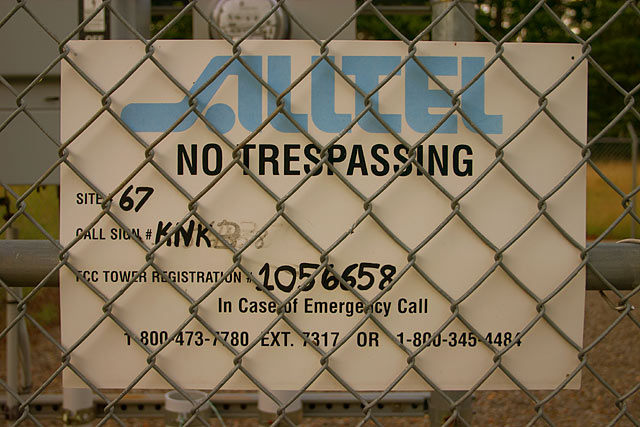 Alltel was very good about marking their sites with plastic site id signs that contained a cell number, regulatory information and an emergency contact number (Fig. 3-1). However, for some reason Alltel stoped this practice and has only sporadically gone back to marking their sites with a metal version of the old site id sign (Fig. 3-2). Most sites, where required, that are or were owned by Alltel also have a plastic FCC ASR number sign (Fig. 3-3). Newer Alltel sites are mostly colocated on other structures so the use of this sign has also become rare. Sites in the Norfolk market actually have black on white stickers on the equipment shelter door that list the site's cell number, name, address as well as a local telephone number. For some reason the last four digits of the telephone number have been obscured. This was probably the telephone number for the out of band management device (a modem) used to monitor and manage the site. A few sites missing the door sticker sign have cell name labels located near the shelter door knob. Former Century Cellunet sites in Mississippi usually have a small metal square site id sign with FCC regulatory information and cell site information (Fig. 3-4). Former GTE Mobilnet sites in Floridia have a generic sticker affixed to the door that lists a cell sites contact information and FCC callsign information (Fig. 3-5).